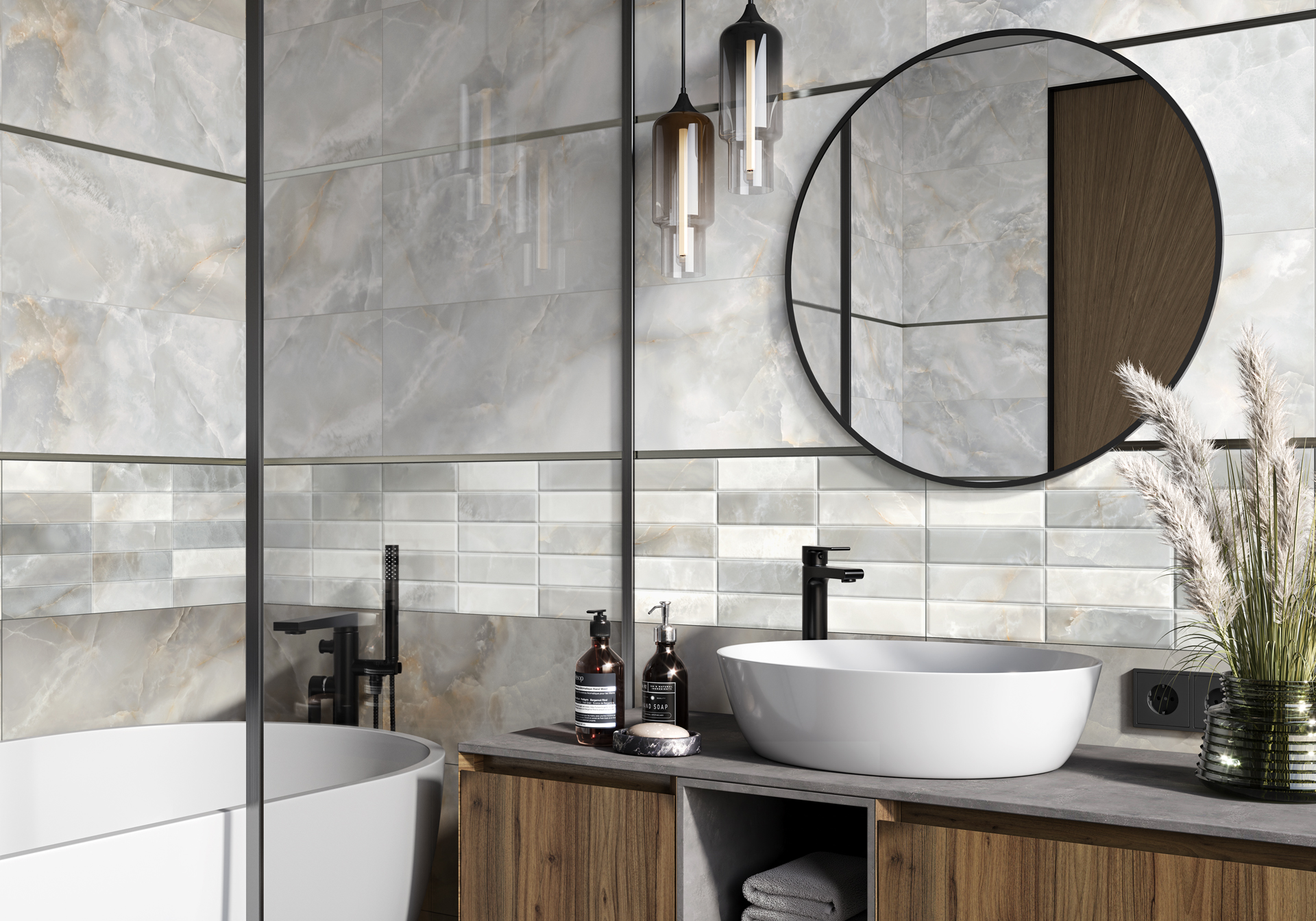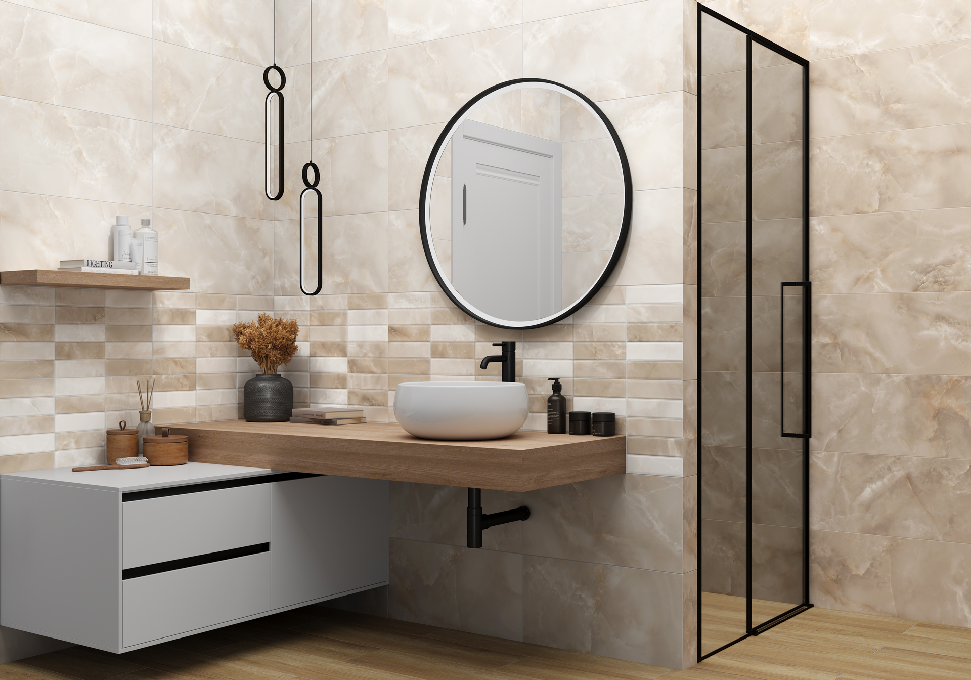Керамическая плитка коллекции Azimut — простое и стильное решение для создания уютного и современного пространства в ванной комнате. Формат — 300x600 мм с мягкой матовой поверхностью. Палитра в спокойных бежевых и серых оттенках создаст тёплую и расслабляющую атмосферу. Ключевой акцент — декоративный массив с рельефом кирпичей. Каждый кирпичик имеет благородную мраморную текстуру и сочетает несколько оттенков, образуя живописную мозаику. Это добавляет стенам интересный ритм и динамику. Такой декор можно применить не только в ванной комнате, но и на кухне в качестве фартука над столешницей, что позволит стилизовать помещение и будет практичным решением в этой зоне. Напольный керамогранит и декоративный бордюр помогут создать завершённый образ вашего пространства.